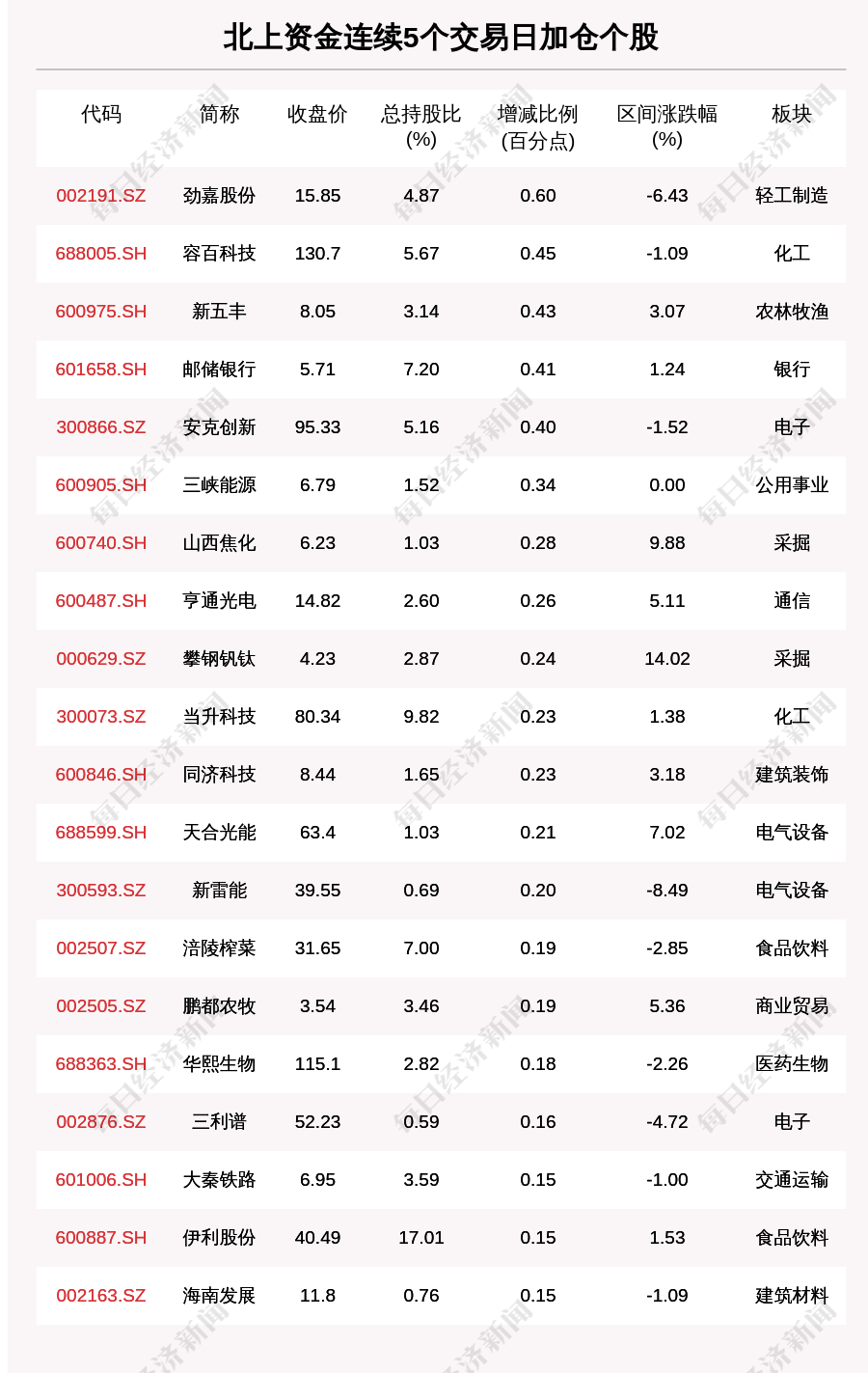 每經(jīng)AI快訊,2月22日,北上資金連續(xù)5個交易日買入32個股。北上資金連續(xù)5個交易日加倉個股中,勁嘉股份(002191.SZ,收盤價:15.85元)增持比例增幅最大,5個交易日增持0.60個百分點,其他增持比例較大的個股包括容百科技(688005.SH,收盤價:130.7元)、新五豐(600975.SH,收盤價:8.05元)、郵儲銀行(601658.SH,收盤價:5.71元),分別增持0.45個百分點、0.43個百分點、0.41個百分點。