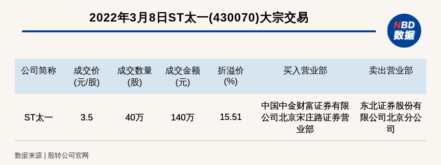 每經(jīng)訊,2022年3月8日,新三板基礎(chǔ)層公司ST太一(430070)發(fā)生一筆大宗交易,成交價(jià)3.5元/股,成交數(shù)量40萬(wàn)股,成交金額140萬(wàn)元,溢價(jià)15.51%。買(mǎi)入營(yíng)業(yè)部是中國(guó)中金財(cái)富證券有限公司北京宋莊路證券營(yíng)業(yè)部,賣(mài)出營(yíng)業(yè)部是東北證券股份有限公司北京分公司。