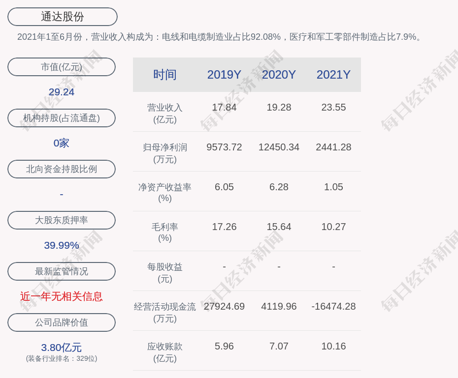 每經(jīng)AI快訊,通達(dá)股份(SZ 002560,收盤價(jià):5.53元)3月18日晚間發(fā)布年度業(yè)績報(bào)告稱,2021年?duì)I業(yè)收入約23.55億元,同比增加22.13%;歸屬于上市公司股東的凈利潤盈利約2441萬元,同比減少80.39%;基本每股收益盈利0.05元,同比減少81.48%。
