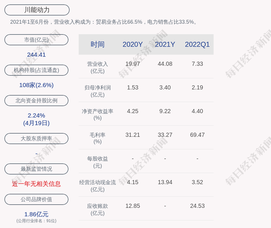 2021年1至6月份,川能動(dòng)力的營業(yè)收入構(gòu)成為:貿(mào)易業(yè)務(wù)占比66.5%,電力銷售占比33.5%。