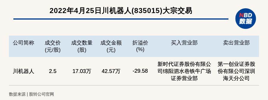 每經(jīng)訊,2022年4月25日,新三板基礎(chǔ)層公司川機器人(835015)發(fā)生一筆大宗交易,成交價2.5元/股,成交數(shù)量17.03萬股,成交金額42.57萬元,折價29.58%。買入營業(yè)部是新時代證券股份有限公司綿陽泗水巷鐵牛廣場證券營業(yè)部,賣出營業(yè)部是第一創(chuàng)業(yè)證券股份有限公司深圳海天分公司。