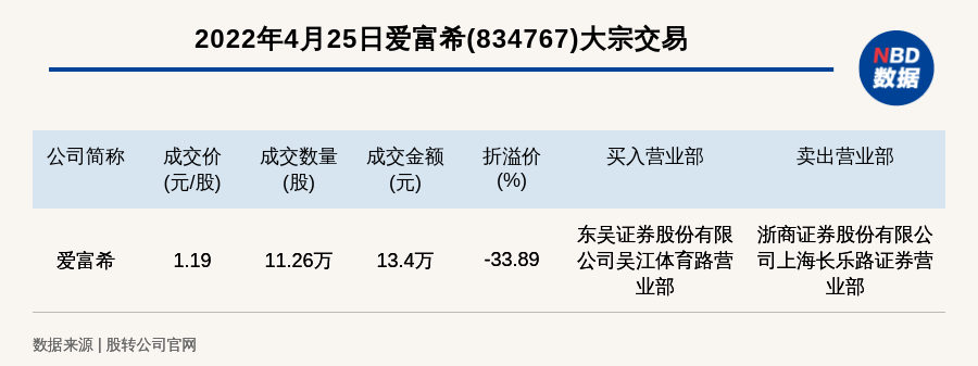 每經(jīng)訊,2022年4月25日,新三板基礎(chǔ)層公司愛(ài)富希(834767)發(fā)生一筆大宗交易,成交價(jià)1.19元/股,成交數(shù)量11.26萬(wàn)股,成交金額13.4萬(wàn)元,折價(jià)33.89%。買(mǎi)入營(yíng)業(yè)部是東吳證券股份有限公司吳江體育路營(yíng)業(yè)部,賣(mài)出營(yíng)業(yè)部是浙商證券股份有限公司上海長(zhǎng)樂(lè)路證券營(yíng)業(yè)部。