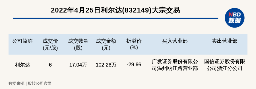 每經(jīng)訊,2022年4月25日,新三板創(chuàng)新層公司利爾達(dá)(832149)發(fā)生一筆大宗交易,成交價6元/股,成交數(shù)量17.04萬股,成交金額102.26萬元,折價29.66%。買入營業(yè)部是廣發(fā)證券股份有限公司溫州甌江路營業(yè)部,賣出營業(yè)部是國信證券股份有限公司浙江分公司。