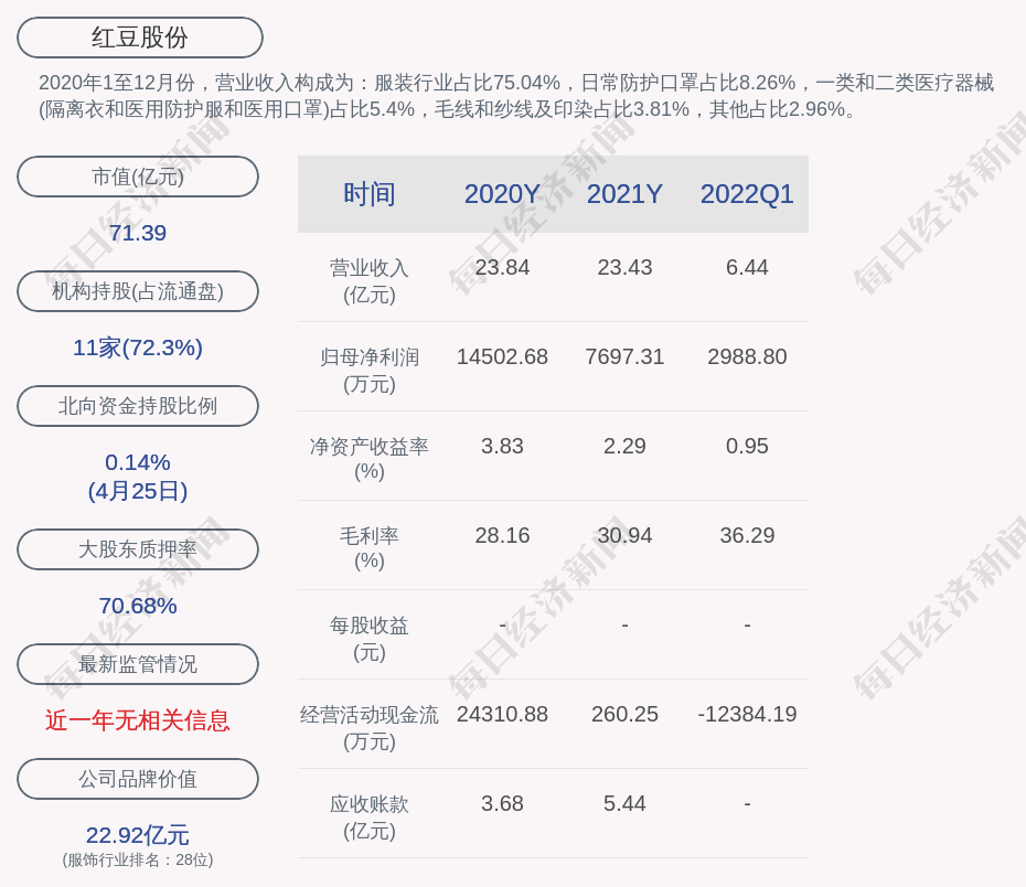 每經(jīng)AI快訊,紅豆股份(SH 600400,收盤價:3.1元)4月26日晚間發(fā)布一季度業(yè)績公告稱,2022年第一季度營收約6.44億元;凈利潤約2989萬元;基本每股收益0.01元。