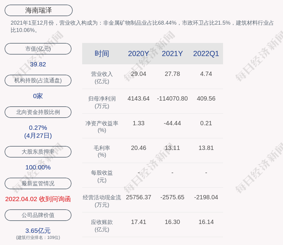 2021年1至12月份,海南瑞澤的營業(yè)收入構(gòu)成為:非金屬礦物制品業(yè)占比68.44%,市政環(huán)衛(wèi)占比21.5%,建筑材料行業(yè)占比10.06%。
