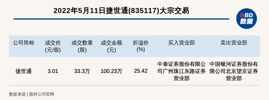 每經(jīng)訊,2022年5月11日,新三板基礎(chǔ)層公司捷世通(835117)發(fā)生一筆大宗交易,成交價3.01元/股,成交數(shù)量33.3萬股,成交金額100.23萬元,溢價25.42%。買入營業(yè)部是中泰證券股份有限公司廣州珠江東路證券營業(yè)部,賣出營業(yè)部是中國銀河證券股份有限公司北京望京證券營業(yè)部。