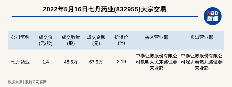 每經(jīng)訊,2022年5月16日,新三板基礎(chǔ)層公司七丹藥業(yè)(832955)發(fā)生一筆大宗交易,成交價(jià)1.4元/股,成交數(shù)量48.5萬股,成交金額67.9萬元,溢價(jià)2.19%。買入營業(yè)部是中泰證券股份有限公司昆明人民東路證券營業(yè)部,賣出營業(yè)部是中泰證券股份有限公司深圳泰然九路證券營業(yè)部。