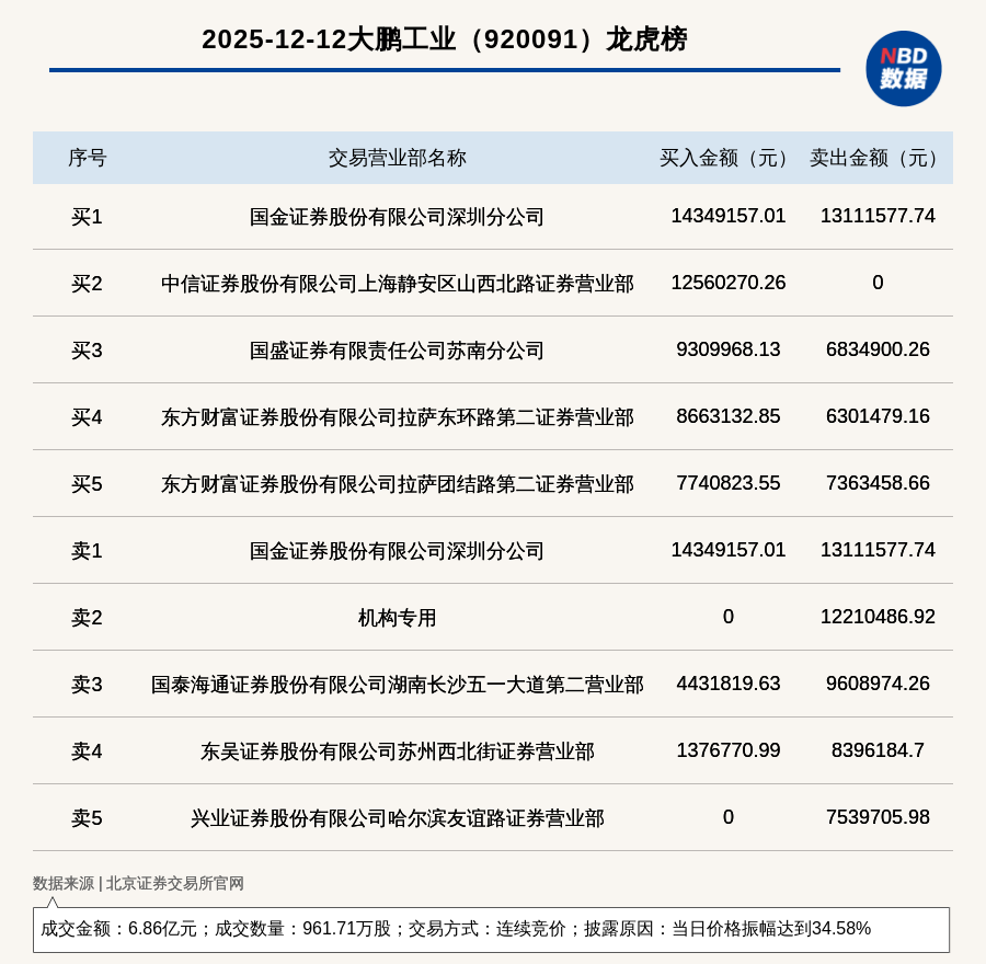 每經(jīng)訊,2025年12月12日,北交所上市公司大鵬工業(yè)(920091,收盤價(jià):75.56元)登上龍虎榜,交易方式是連續(xù)競價(jià),披露原因是當(dāng)日價(jià)格振幅達(dá)到34.58%,成交數(shù)量961.71萬股,成交金額6.86億元。買一席位為國金證券股份有限公司深圳分公司,買入1434.92萬元;賣一席位為國金證券股份有限公司深圳分公司,賣出1311.16萬元。