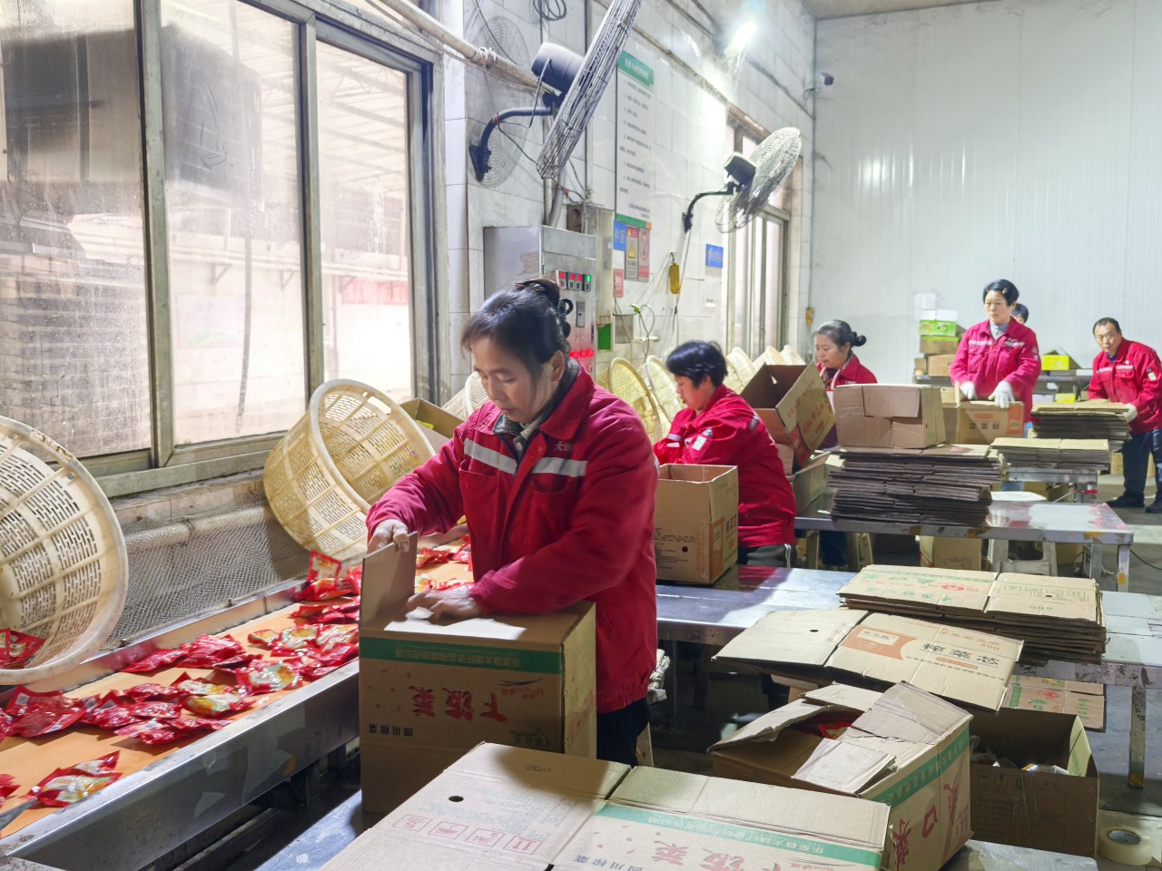 樂至縣大靖軒食品有限公司的自動化流水線,工人正在打包。