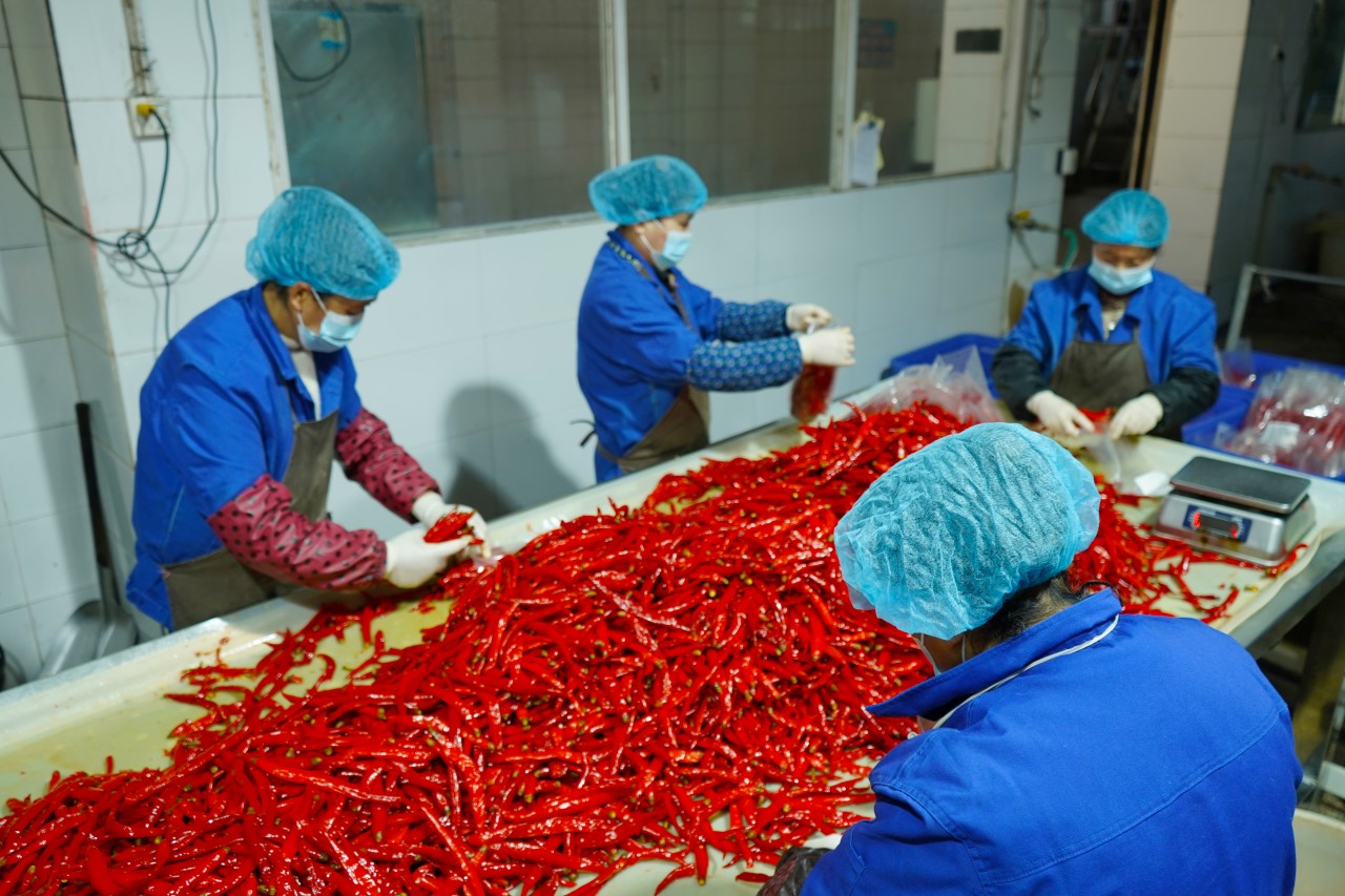 川龍釀造食品有限公司的生產(chǎn)車間內(nèi)工人正在分裝辣椒。受訪者供圖