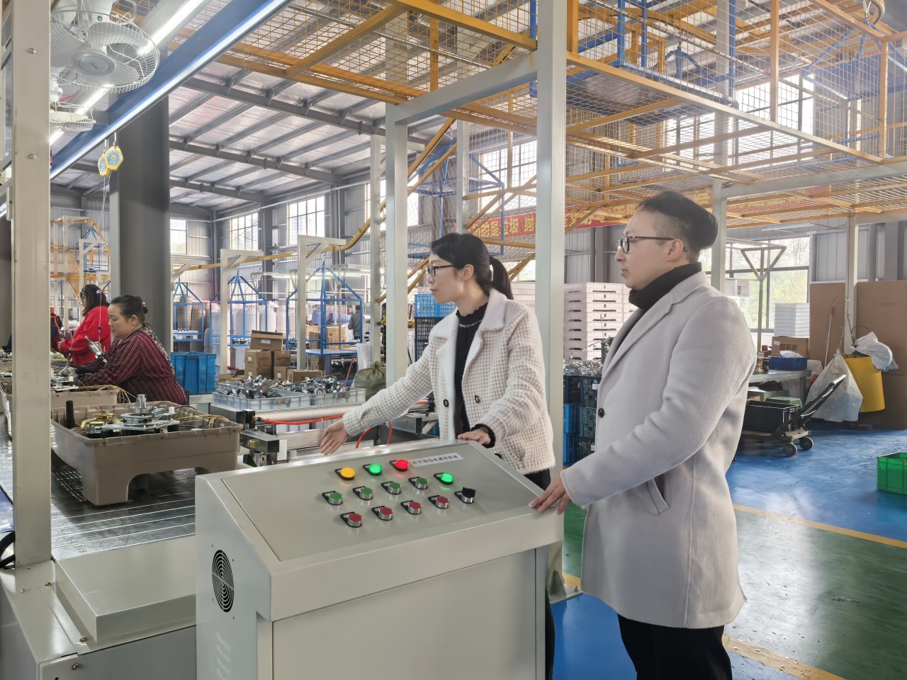 綿陽師范學院智能制造學院博士陳多禮(右)與四川超迪電器實業(yè)有限公司副總經(jīng)理吳冬梅查看智能化產(chǎn)線改造情況。