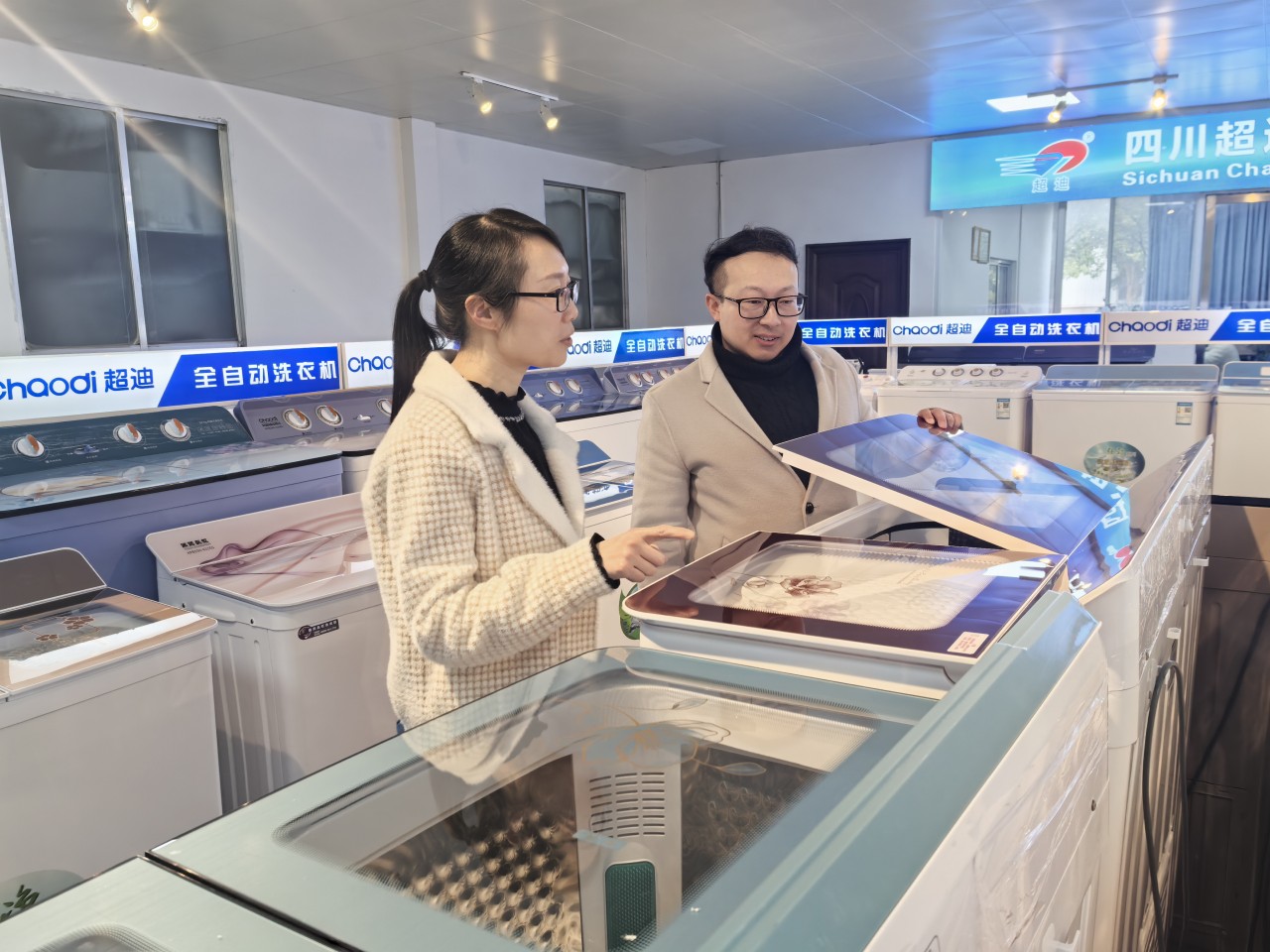 綿陽師范學院智能制造學院博士陳多禮(右)與四川超迪電器實業(yè)有限公司副總經(jīng)理吳冬梅交流產(chǎn)品升級事宜。