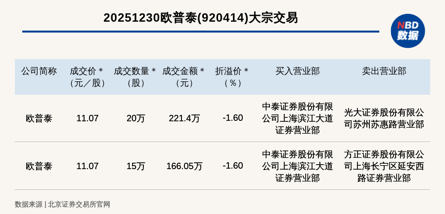 每經(jīng)訊,2025年12月30日,北交所上市公司歐普泰(920414,收盤價(jià):11.25元)發(fā)生2筆大宗交易,總成交金額為387.45萬元,成交金額最高的一筆成交價(jià)11.07元/股,成交數(shù)量20萬股,成交金額221.4萬元,折價(jià)1.6%。買入營業(yè)部是中泰證券股份有限公司上海濱江大道證券營業(yè)部,賣出營業(yè)部是光大證券股份有限公司蘇州蘇惠路營業(yè)部。
