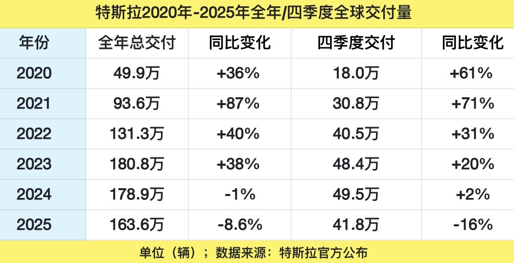 據(jù)《每日經(jīng)濟(jì)新聞》記者觀察,特斯拉2025年四季度和全年的銷(xiāo)量均出現(xiàn)大幅下滑。2025年第四季度,特斯拉交付量較2024年同期減少約16%,產(chǎn)量較2024年同期下降5.5%。就2025年全年來(lái)看,特斯拉的交付量由2024年的178.9萬(wàn)輛下降8.6%至163.6萬(wàn)輛。