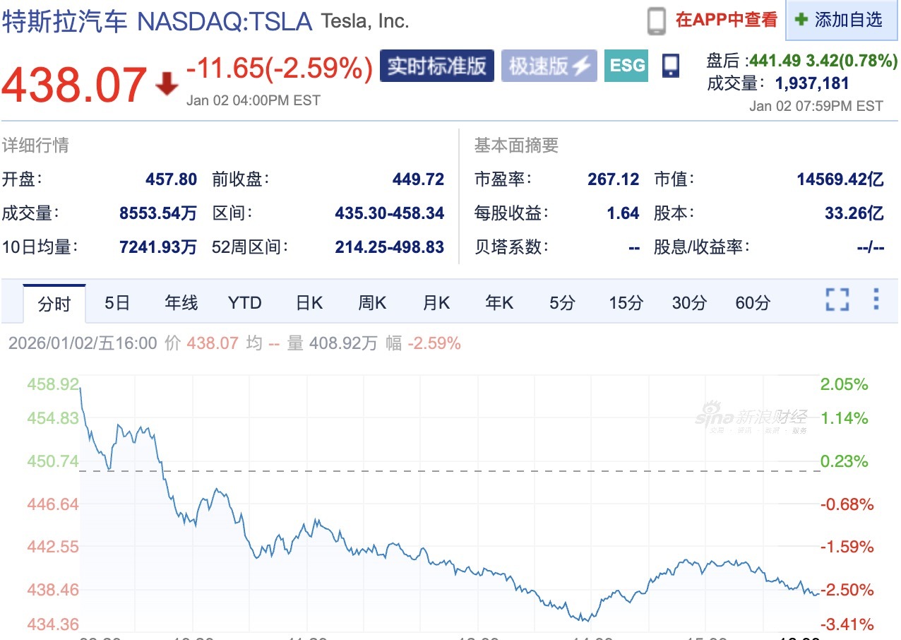 特斯拉方面表示,公司將在當(dāng)?shù)貢r(shí)間2026年1月28日美股收盤(pán)后發(fā)布2025年第四季度財(cái)務(wù)業(yè)績(jī)。截至2026年1月2日美股收盤(pán),特斯拉(NASDAQ:TSLA)股價(jià)下跌2.59%,報(bào)438.07美元/股,總市值1.45萬(wàn)億美元。
