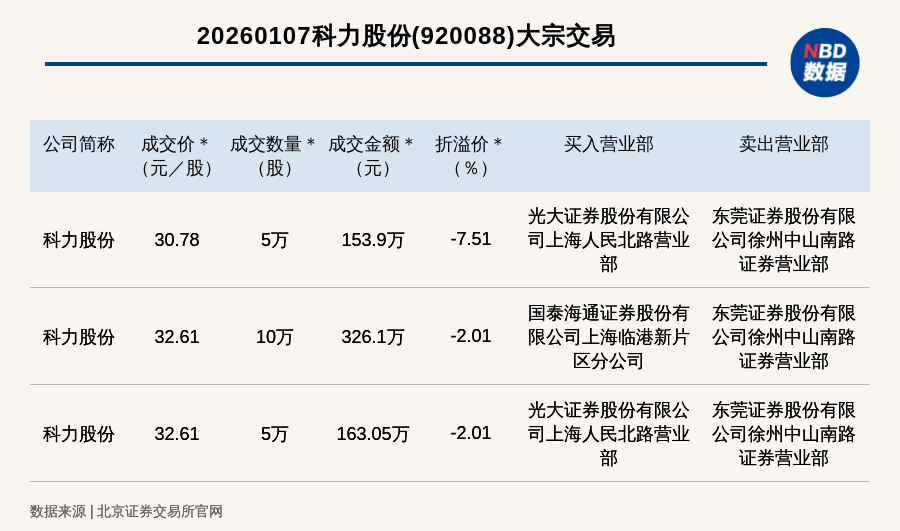 每經(jīng)訊,2026年1月7日,北交所上市公司科力股份(920088,收盤(pán)價(jià):33.28元)發(fā)生3筆大宗交易,折價(jià)率最高的一筆成交價(jià)30.78元/股,成交數(shù)量5萬(wàn)股,成交金額153.9萬(wàn)元,折價(jià)7.51%。買(mǎi)入營(yíng)業(yè)部是光大證券股份有限公司上海人民北路營(yíng)業(yè)部,賣(mài)出營(yíng)業(yè)部是東莞證券股份有限公司徐州中山南路證券營(yíng)業(yè)部。