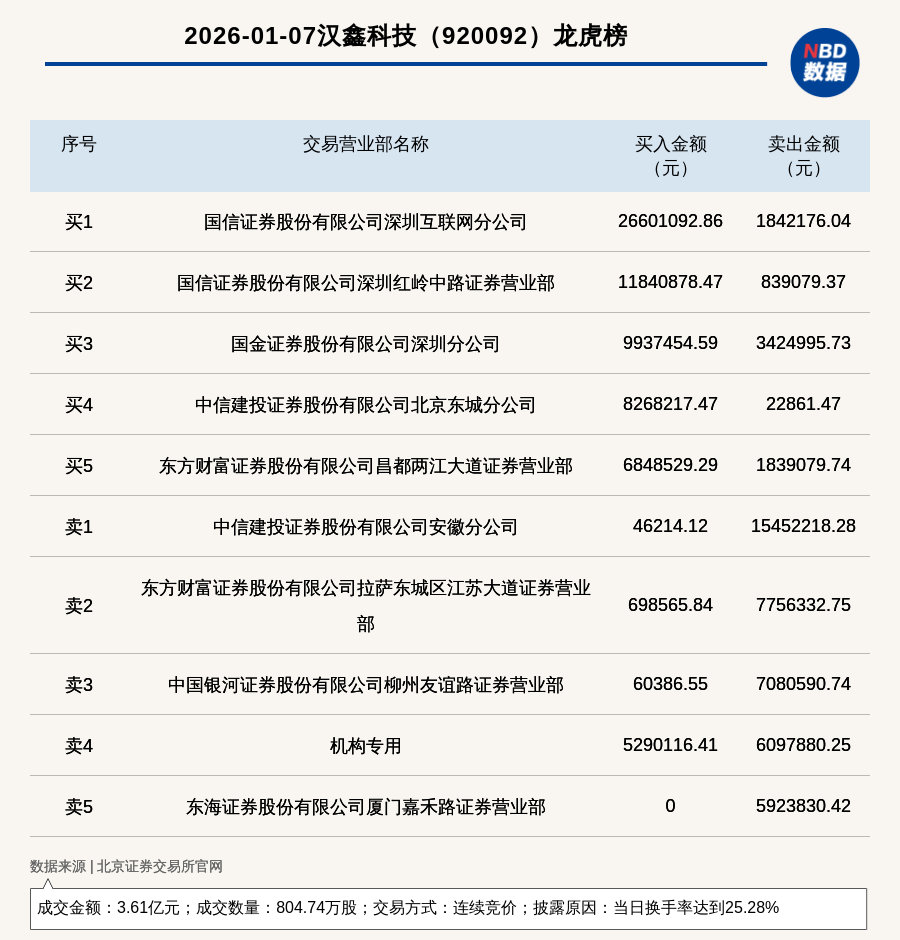 每經(jīng)訊,2026年1月7日,北交所上市公司漢鑫科技(920092,收盤價(jià):43.68元)登上龍虎榜,交易方式是連續(xù)競價(jià),披露原因是當(dāng)日換手率達(dá)到25.28%,成交數(shù)量804.74萬股,成交金額3.61億元。買一席位為國信證券股份有限公司深圳互聯(lián)網(wǎng)分公司,買入2660.11萬元;賣一席位為中信建投證券股份有限公司安徽分公司,賣出1545.22萬元。