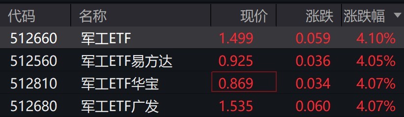 受盤面影響,軍工相關(guān)ETF漲超4%。