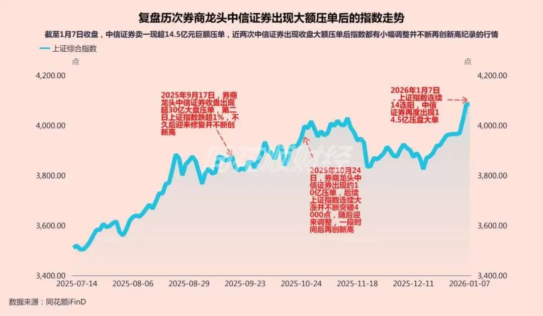 去年的9月17日和10月24日,中信證券曾兩次出現(xiàn)過超10億元的巨額壓?jiǎn)巍4饲笆袌?chǎng)將這樣的盤口理解為“給過熱的情緒降溫”,或者更直白一點(diǎn)——(暫時(shí))不讓漲。