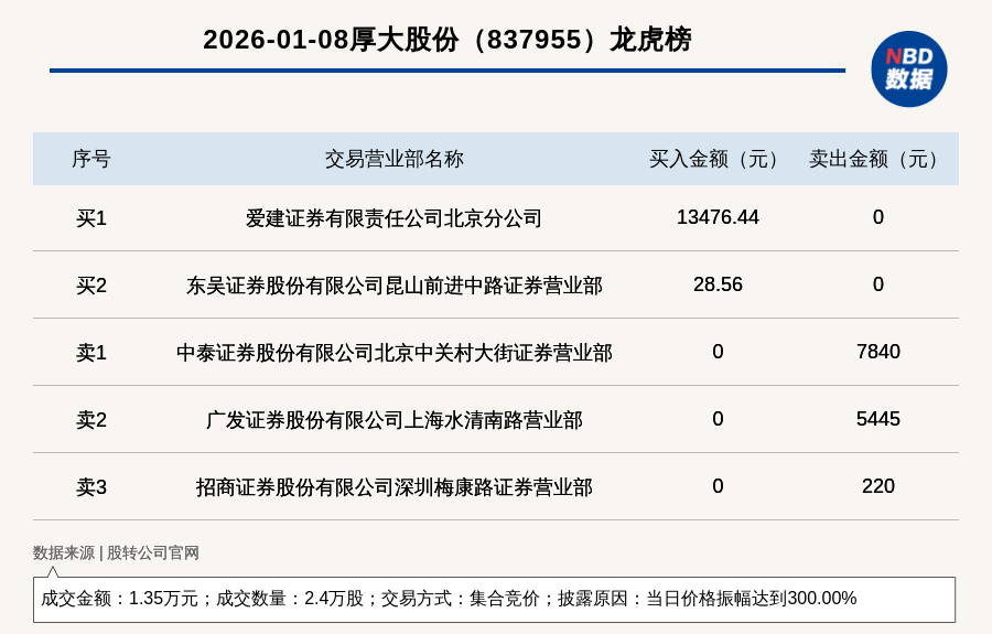 每經(jīng)訊,2026年1月8日,新三板基礎(chǔ)層公司厚大股份(837955,收盤價:0.56元)登上龍虎榜,交易方式是集合競價,披露原因是當日價格振幅達到300.00%,成交數(shù)量2.4萬股,成交金額1.35萬元。買一席位為愛建證券有限責任公司北京分公司,買入1.35萬元;賣一席位為中泰證券股份有限公司北京中關(guān)村大街證券營業(yè)部,賣出7840元。