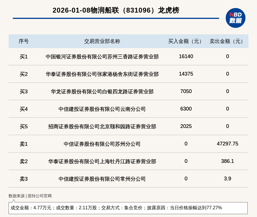 每經(jīng)訊,2026年1月8日,新三板創(chuàng)新層公司物潤船聯(lián)(831096,收盤價(jià):3.9元)登上龍虎榜,交易方式是集合競價(jià),披露原因是當(dāng)日價(jià)格振幅達(dá)到77.27%,成交數(shù)量2.11萬股,成交金額4.77萬元。買一席位為中國銀河證券股份有限公司蘇州三香路證券營業(yè)部,買入1.61萬元;賣一席位為中信證券股份有限公司蘇州分公司,賣出4.73萬元。