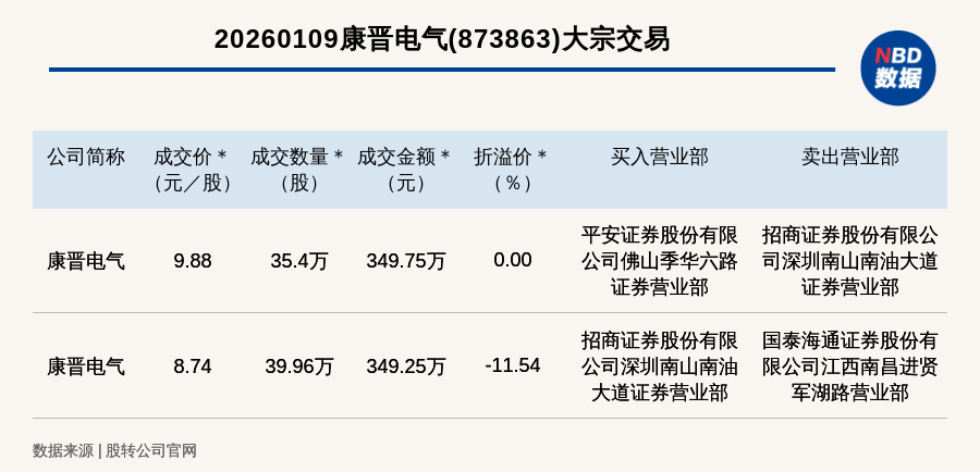 每經(jīng)訊,2026年1月9日,新三板創(chuàng)新層公司康晉電氣(873863,收盤價(jià):9.88元)發(fā)生2筆大宗交易,總成交金額為699萬元,成交金額最高的一筆成交價(jià)9.88元/股,成交數(shù)量35.4萬股,成交金額349.75萬元,為平價(jià)交易。買入營業(yè)部是平安證券股份有限公司佛山季華六路證券營業(yè)部,賣出營業(yè)部是招商證券股份有限公司深圳南山南油大道證券營業(yè)部。