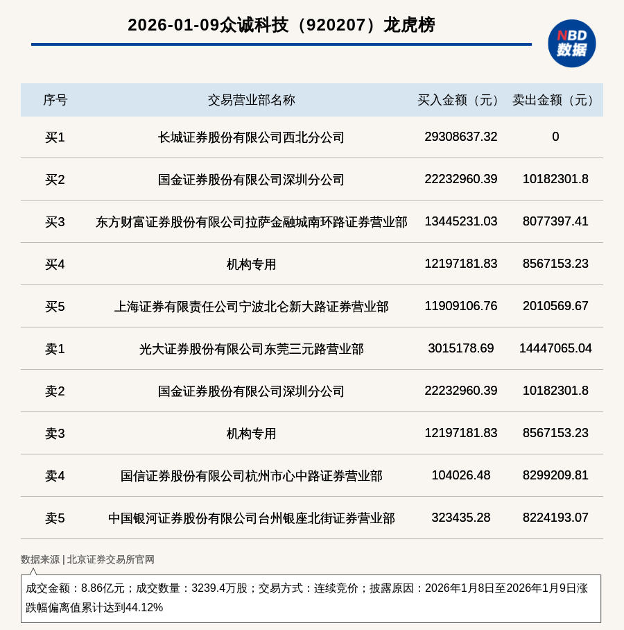 每經(jīng)訊,2026年1月9日,北交所上市公司眾誠科技(920207,收盤價:32元)登上龍虎榜,交易方式是連續(xù)競價,披露原因是2026年1月8日至2026年1月9日漲跌幅偏離值累計達到44.12%,成交數(shù)量3239.4萬股,成交金額8.86億元。買一席位為長城證券股份有限公司西北分公司,買入2930.86萬元;賣一席位為光大證券股份有限公司東莞三元路營業(yè)部,賣出1444.71萬元。