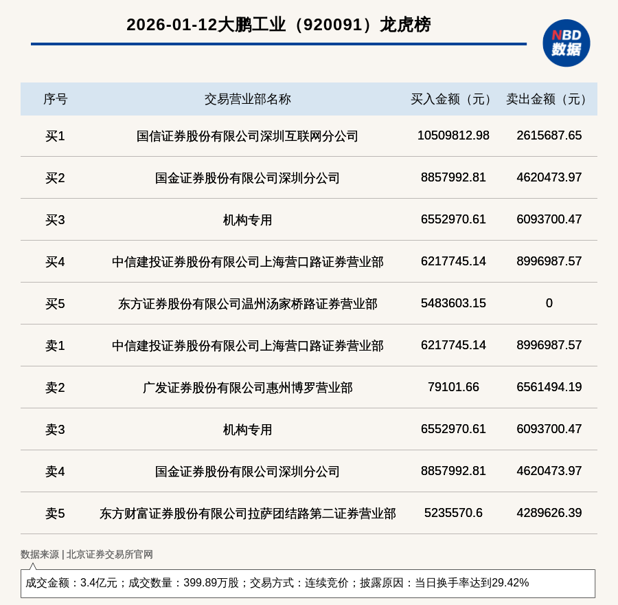 每經(jīng)訊,2026年1月12日,北交所上市公司大鵬工業(yè)(920091,收盤價:85.62元)登上龍虎榜,交易方式是連續(xù)競價,披露原因是當(dāng)日換手率達(dá)到29.42%,成交數(shù)量399.89萬股,成交金額3.4億元。買一席位為國信證券股份有限公司深圳互聯(lián)網(wǎng)分公司,買入1050.98萬元;賣一席位為中信建投證券股份有限公司上海營口路證券營業(yè)部,賣出899.7萬元。