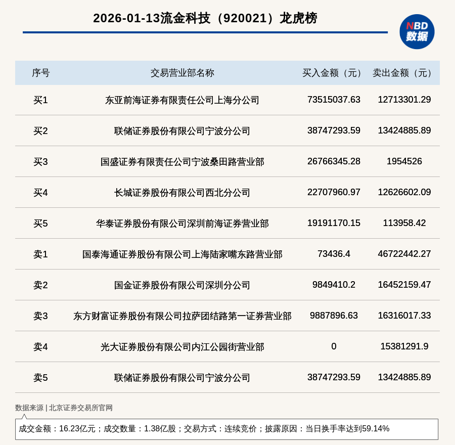 每經(jīng)訊,2026年1月13日,北交所上市公司流金科技(920021,收盤(pán)價(jià):10.44元)登上龍虎榜,交易方式是連續(xù)競(jìng)價(jià),披露原因是當(dāng)日換手率達(dá)到59.14%,成交數(shù)量1.38億股,成交金額16.23億元。買(mǎi)一席位為東亞前海證券有限責(zé)任公司上海分公司,買(mǎi)入7351.5萬(wàn)元;賣(mài)一席位為國(guó)泰海通證券股份有限公司上海陸家嘴東路營(yíng)業(yè)部,賣(mài)出4672.24萬(wàn)元。