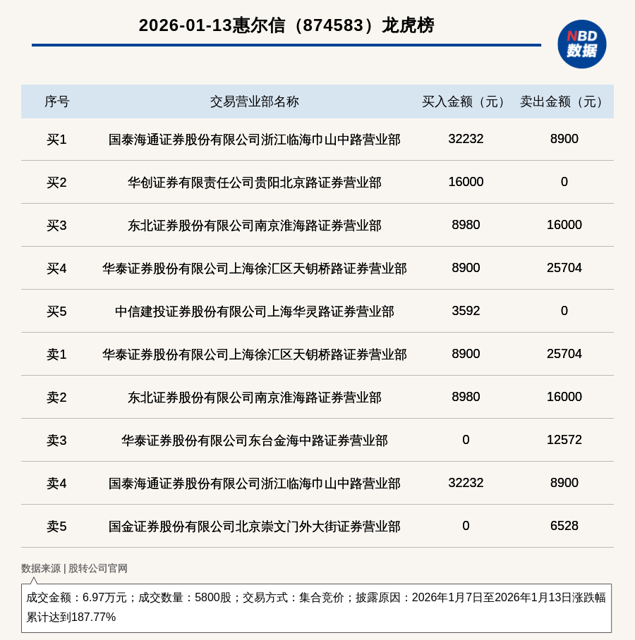 每經(jīng)訊,2026年1月13日,新三板創(chuàng)新層公司惠爾信(874583,收盤價:16元)登上龍虎榜,交易方式是集合競價,披露原因是2026年1月7日至2026年1月13日漲跌幅累計達(dá)到187.77%,成交數(shù)量5800股,成交金額6.97萬元。買一席位為國泰海通證券股份有限公司浙江臨海巾山中路營業(yè)部,買入3.22萬元;賣一席位為華泰證券股份有限公司上海徐匯區(qū)天鑰橋路證券營業(yè)部,賣出2.57萬元。