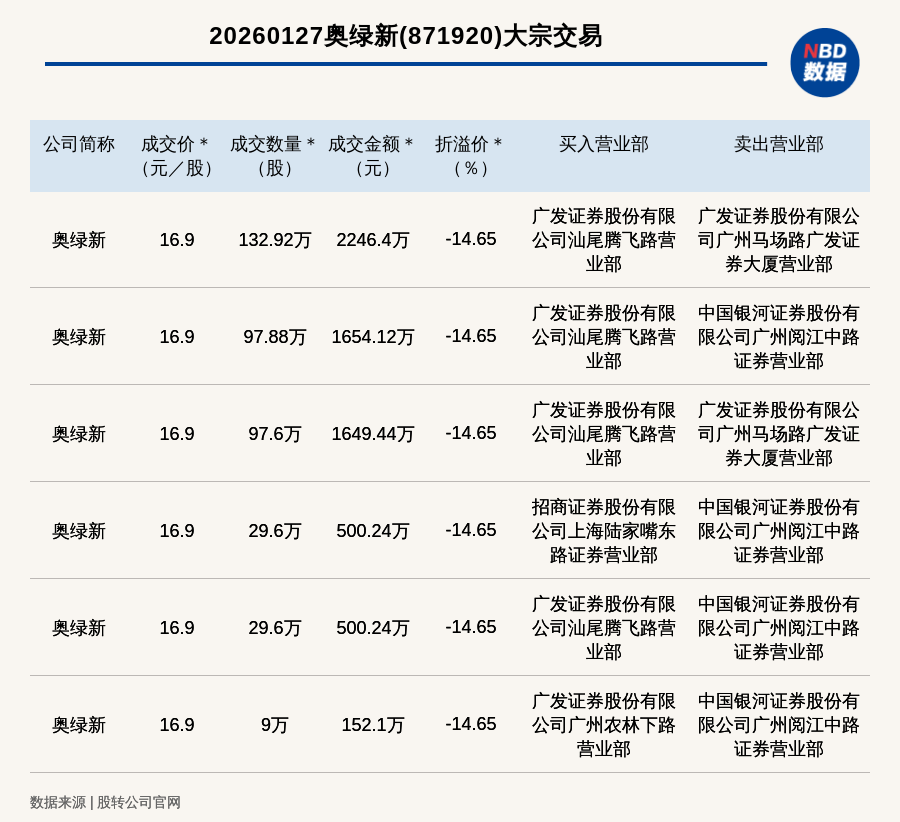每經(jīng)訊,2026年1月27日,新三板基礎(chǔ)層公司奧綠新(871920,收盤價:19.8元)發(fā)生6筆大宗交易,總成交金額為6702.54萬元,成交金額最高的一筆成交價16.9元/股,成交數(shù)量132.92萬股,成交金額2246.4萬元,折價14.65%。買入營業(yè)部是廣發(fā)證券股份有限公司汕尾騰飛路營業(yè)部,賣出營業(yè)部是廣發(fā)證券股份有限公司廣州馬場路廣發(fā)證券大廈營業(yè)部。