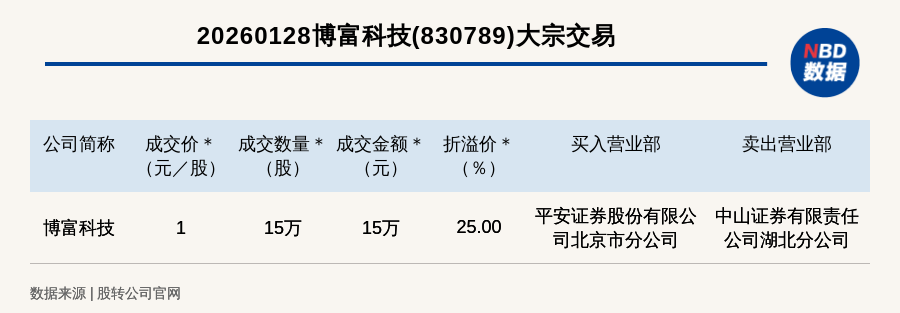 每經(jīng)訊,2026年1月28日,新三板基礎(chǔ)層公司博富科技(830789,收盤價:0.8元)發(fā)生一筆大宗交易,成交價1元/股,成交數(shù)量15萬股,成交金額15萬元,溢價25%。買入營業(yè)部是平安證券股份有限公司北京市分公司,賣出營業(yè)部是中山證券有限責(zé)任公司湖北分公司。