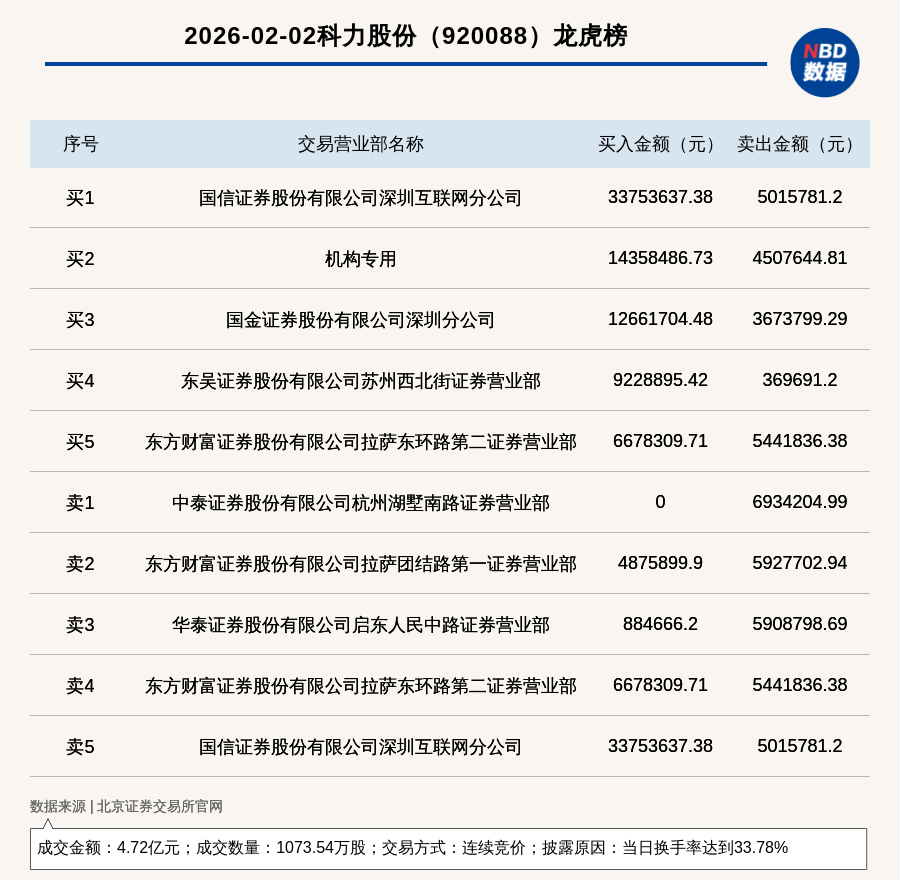 每經(jīng)訊,2026年2月2日,北交所上市公司科力股份(920088,收盤價(jià):42.5元)登上龍虎榜,交易方式是連續(xù)競(jìng)價(jià),披露原因是當(dāng)日換手率達(dá)到33.78%,成交數(shù)量1073.54萬(wàn)股,成交金額4.72億元。買一席位為國(guó)信證券股份有限公司深圳互聯(lián)網(wǎng)分公司,買入3375.36萬(wàn)元;賣一席位為中泰證券股份有限公司杭州湖墅南路證券營(yíng)業(yè)部,賣出693.42萬(wàn)元。