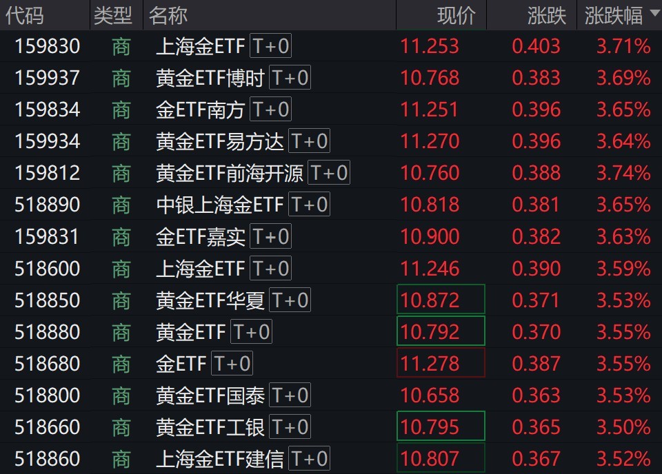 2月4日,現(xiàn)貨黃金日內漲幅擴大至2%,場內商品黃金相關ETF大漲超3%。