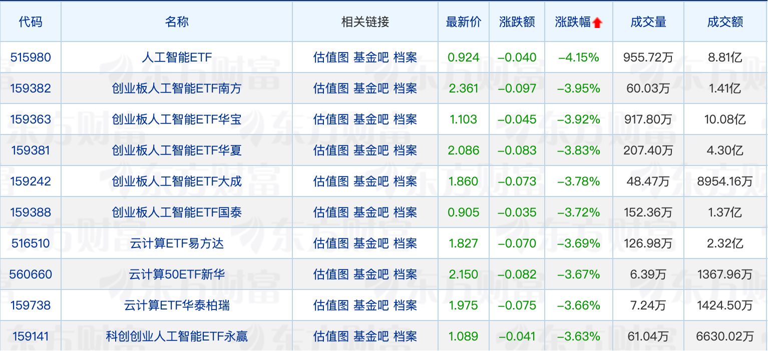 下跌方面,人工智能ETF領跌4.15%,多只創(chuàng)業(yè)板人工智能ETF回調居前。