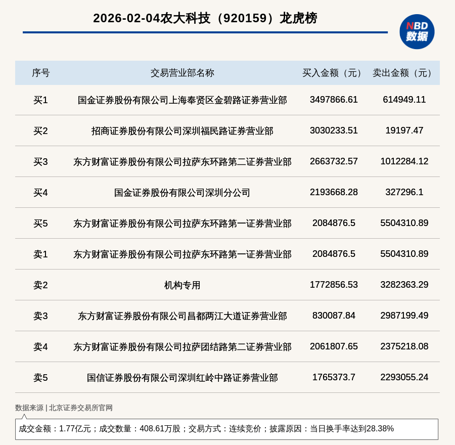 每經(jīng)訊,2026年2月4日,北交所上市公司農(nóng)大科技(920159,收盤價(jià):42.66元)登上龍虎榜,交易方式是連續(xù)競(jìng)價(jià),披露原因是當(dāng)日換手率達(dá)到28.38%,成交數(shù)量408.61萬股,成交金額1.77億元。買一席位為國(guó)金證券股份有限公司上海奉賢區(qū)金碧路證券營(yíng)業(yè)部,買入349.79萬元;賣一席位為東方財(cái)富證券股份有限公司拉薩東環(huán)路第一證券營(yíng)業(yè)部,賣出550.43萬元。