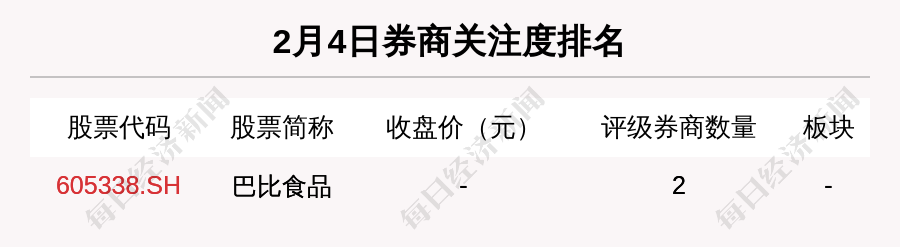 從券商對(duì)個(gè)股的關(guān)注程度來(lái)看,有1只個(gè)股獲得多家券商關(guān)注,券商關(guān)注數(shù)量排名居前的個(gè)股是巴比食品(605338.SH)。