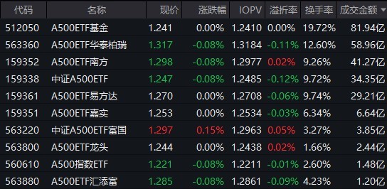 截至上午收盤,場內跟蹤中證A500指數的ETF漲跌互現。其中,有10只中證A500相關ETF成交額超1億元,2只超58億元。A500ETF基金、A500ETF華泰柏瑞早盤成交額分別為81.94億元、58.96億元。