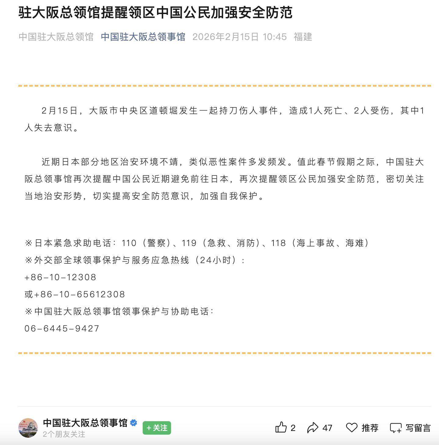 2月15日,中國(guó)駐大阪總領(lǐng)館提醒領(lǐng)區(qū)中國(guó)公民加強(qiáng)安全防范。全文如下: