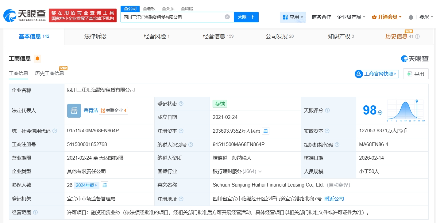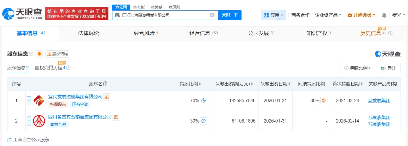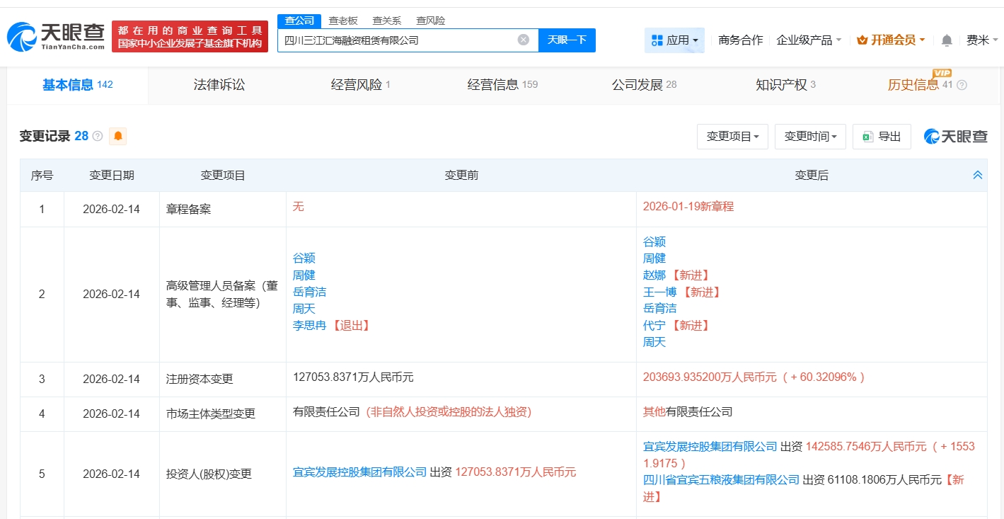 每經(jīng)AI快訊,天眼查App顯示,近日,四川三江匯海融資租賃有限公司發(fā)生工商變更,新增四川省宜賓五糧液集團(tuán)有限公司為股東,同時(shí),注冊(cè)資本由約12.7億元人民幣增至約20.4億元人民幣,增幅約60%。該公司成立于2021年2月,法定代表人為岳育潔,經(jīng)營(yíng)范圍為融資租賃業(yè)務(wù),現(xiàn)由宜賓發(fā)展控股集團(tuán)有限公司及上述新增股東共同持股。