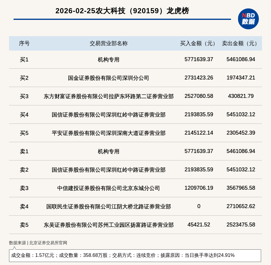 每經(jīng)訊,2026年2月25日,北交所上市公司農(nóng)大科技(920159,收盤(pán)價(jià):42.99元)登上龍虎榜,交易方式是連續(xù)競(jìng)價(jià),披露原因是當(dāng)日換手率達(dá)到24.91%,成交數(shù)量358.68萬(wàn)股,成交金額1.57億元。買(mǎi)一席位為機(jī)構(gòu)專用,買(mǎi)入577.16萬(wàn)元;賣(mài)一席位為機(jī)構(gòu)專用,賣(mài)出546.11萬(wàn)元。