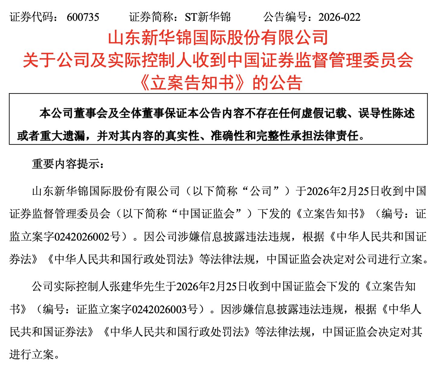 2月25日晚,ST新華錦(600735.SH)公告稱,公司于2026年2月25日收到中國證監(jiān)會下發(fā)的《立案告知書》,因涉嫌信息披露違法違規(guī),中國證監(jiān)會決定對公司進(jìn)行立案。同時,公司實(shí)際控制人張建華也因涉嫌信息披露違法違規(guī)被立案。目前公司經(jīng)營正常,將積極配合調(diào)查并及時履行信息披露義務(wù)。