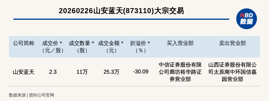 每經(jīng)訊,2026年2月26日,新三板創(chuàng)新層公司山安藍(lán)天(873110,收盤價(jià):3.29元)發(fā)生一筆大宗交易,成交價(jià)2.3元/股,成交數(shù)量11萬股,成交金額25.3萬元,折價(jià)30.09%。買入營(yíng)業(yè)部是中信證券股份有限公司廊坊裕華路證券營(yíng)業(yè)部,賣出營(yíng)業(yè)部是山西證券股份有限公司太原南中環(huán)國(guó)信嘉園營(yíng)業(yè)部。