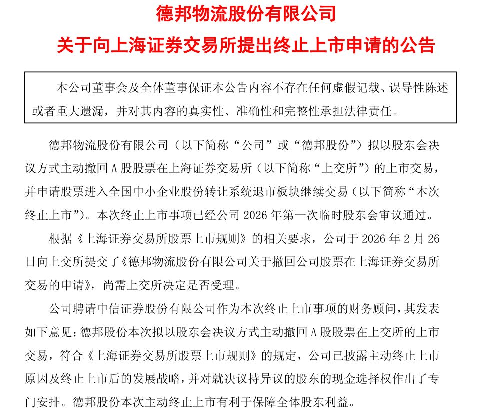 公告表示,本次終止上市事項已經(jīng)公司2026年第一次臨時股東會審議通過。根據(jù)《上海證券交易所股票上市規(guī)則》的相關(guān)要求,公司于2026 年2 月26日向上交所提交了《德邦物流股份有限公司關(guān)于撤回公司股票在上海證券交易所交易的申請》,尚需上交所決定是否受理。