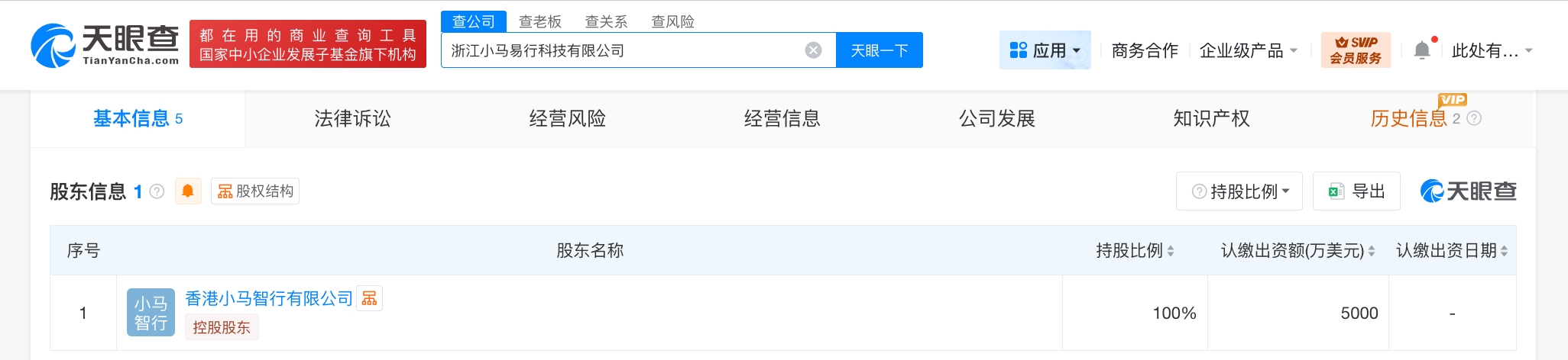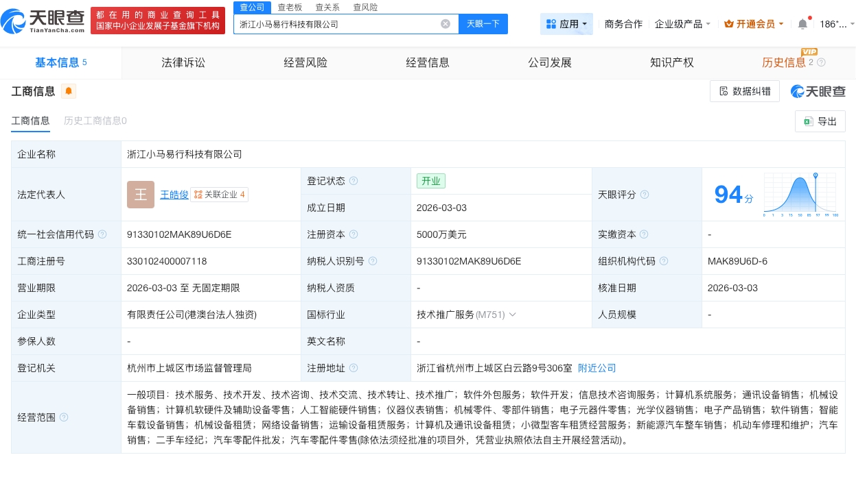 每經(jīng)AI快訊,天眼查工商信息顯示,近日,浙江小馬易行科技有限公司成立,法定代表人為王皓俊,注冊(cè)資本5000萬(wàn)美元,經(jīng)營(yíng)范圍含軟件外包服務(wù)、軟件開(kāi)發(fā)、信息技術(shù)咨詢(xún)服務(wù)、計(jì)算機(jī)系統(tǒng)服務(wù)、通訊設(shè)備銷(xiāo)售、人工智能硬件銷(xiāo)售、電子產(chǎn)品銷(xiāo)售、新能源汽車(chē)整車(chē)銷(xiāo)售等。股東信息顯示,該公司由香港小馬智行有限公司全資持股。