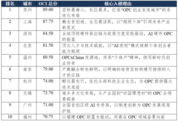 各地的OPC稟賦,有一個排名可以作為參考:今年2月,清華大學新聞與傳播學院新媒體研究中心等聯(lián)合發(fā)布“2026中國OPC創(chuàng)業(yè)城市發(fā)展指數(shù)及排行榜”,蘇州、上海位列第一梯隊,深圳、北京、溫州、南京等四城為第二梯隊,杭州、無錫、廣州、福州等為第三梯隊。