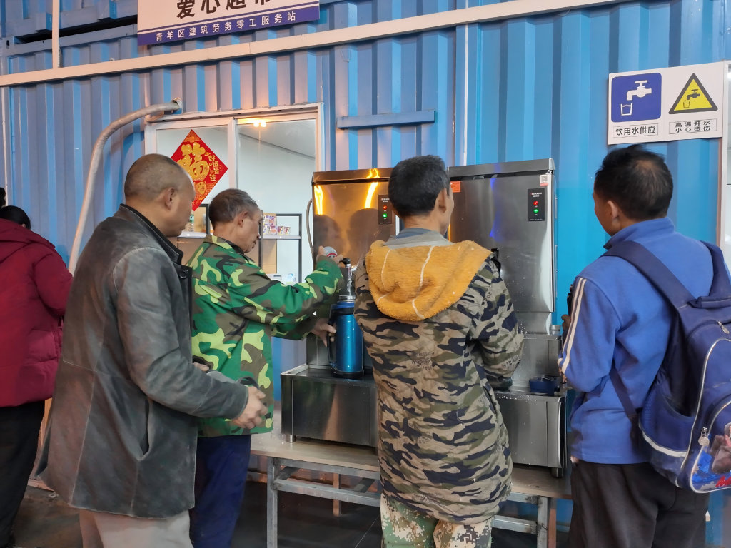 工人們在服務站接熱水。