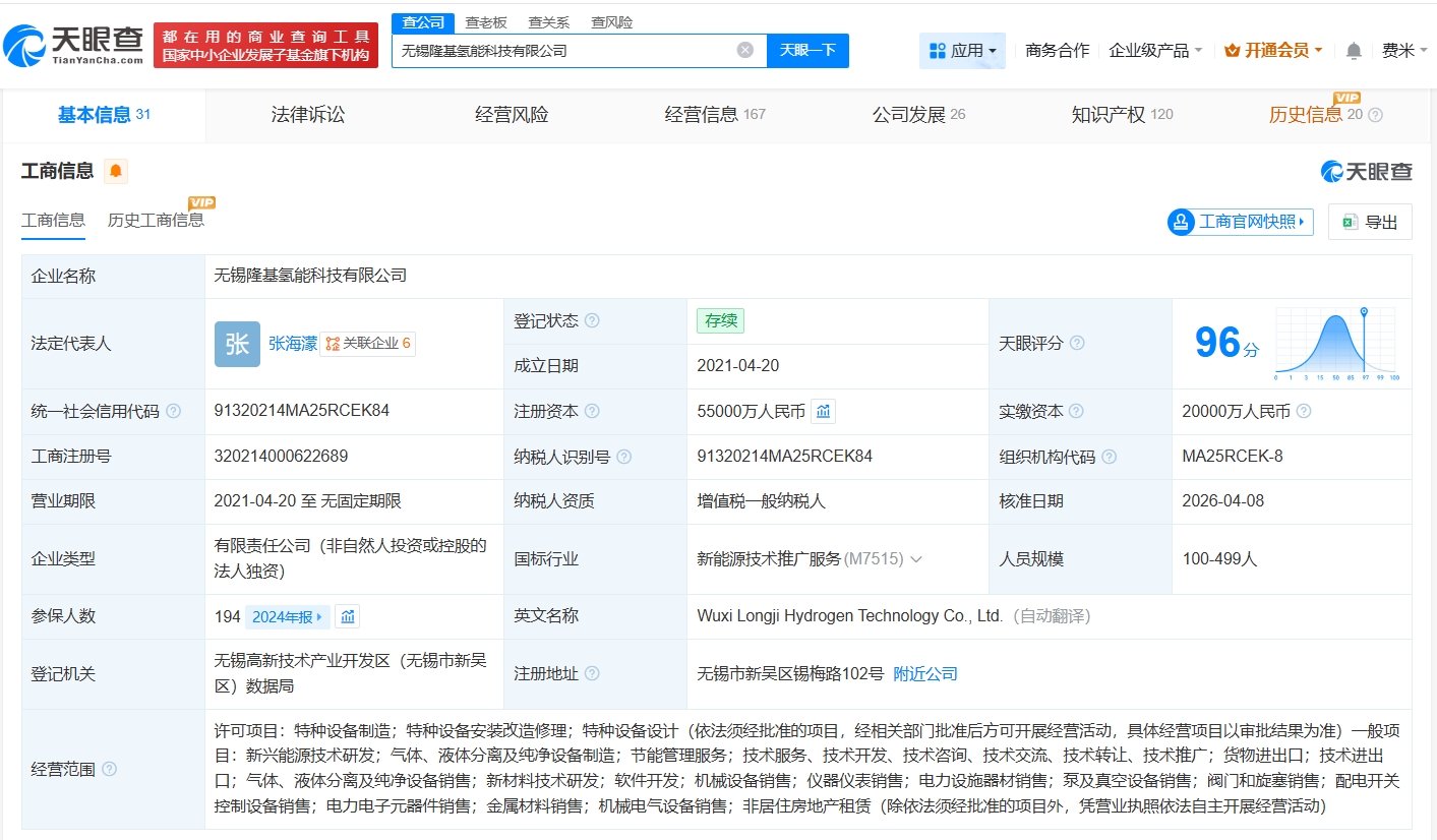 每經AI快訊,天眼查App顯示,近日,無錫隆基氫能科技有限公司發(fā)生工商變更,注冊資本由4.5億元人民幣增至5.5億元人民幣,增幅約22%。該公司成立于2021年4月,法定代表人為張海濛,經營范圍包括特種設備制造、新興能源技術研發(fā)、節(jié)能管理服務等,由隆基綠能旗下西安隆基氫能科技有限公司全資持股。