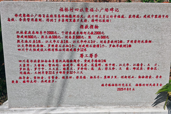 “江文華石桌一張,漢林家庭農(nóng)場(chǎng)李平2000元,王勇軍等22名鄉(xiāng)鄰籌勞32個(gè)工天……”在福橋村“和美小院”示范點(diǎn),一座名為《福橋村四社聚福小廣場(chǎng)碑記》的石碑上,每一筆捐款捐物、每一次投工投勞都被鮮紅的筆墨鐫刻下來(lái)。在滿井,這樣的石碑共有6處,它們成為當(dāng)?shù)厝罕娍诳谙鄠鞯目诒托闹械呢S碑。