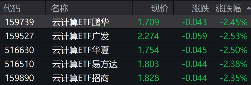 受盤面影響,云計算相關(guān)ETF跌超2%。